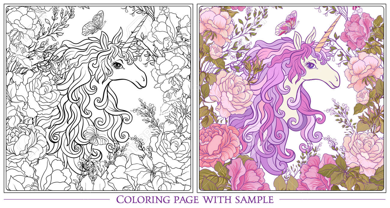 Poster Mit Dem Einhorn Ein Strauss Rosen Und Schmetterlinge Auf Weissem Hintergrund Umrisszeichnung Malvorlage Mit Farbigem Muster Malbuch Fur Erwachsene Stock Vektor Lizenzfrei Nutzbare Vektorgrafiken Clip Arts Illustrationen Image 86422532